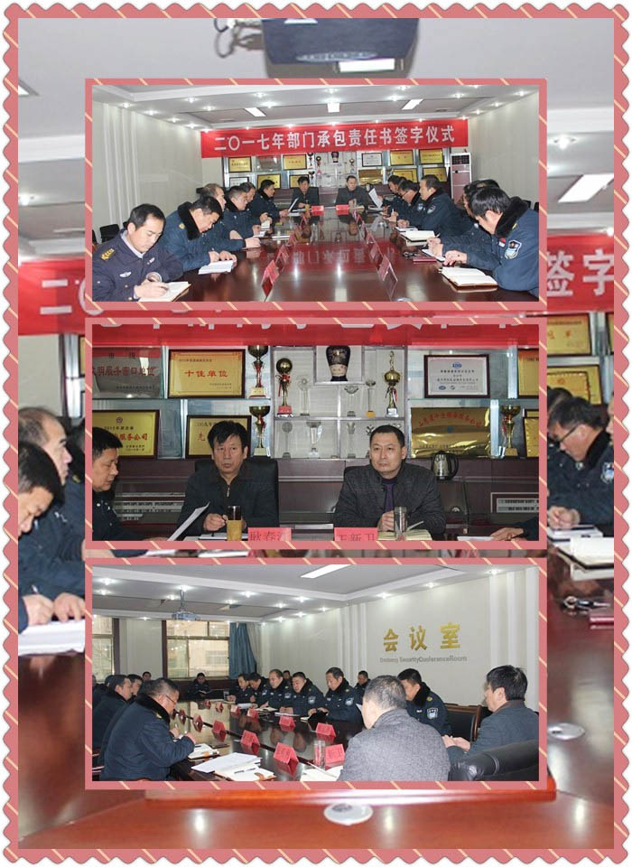 會議進行三項內容,一簽訂目標責任書。大隊與各中隊分別簽訂2017年目標責任書,通過簽訂目標責任書強化中隊的責任、明確目標方向,提升了人員的積極性,為實現明年工作任務打下基礎。二實行獎懲機制,加強隊伍建設,促進業務發展。根據今年完成目標任務情況,大隊采取獎懲辦法,對任務目標完成好的中隊長及班長進行升職加薪,有力的提高了大家的工作積極性,為今后的業務拓展奠定了堅實的基礎。三大隊全年工作的總結。總結會上,王經理充分肯定了2016年二大隊的工作成績。他指出二大隊全年圍繞保安市場,堅持主業為主、多種經營方式并存的發展模式,不斷拓寬保安市場,取得了可喜可賀的成績。在隊伍建設上,規范機構設置,分工明確,各負其責。另外不斷加強隊員崗前培訓,崗中教育指導,著實提升了隊伍的“外在形象、內在素質”。同時也著重分析了存在的問題和不足。他說2017年我們要圍繞主業,進一步放大優勢,再接再厲,率先發展,抓好隊伍、帶好班子,適應新形勢,保持清醒頭腦,克服慣性思維,增強創新,優化主業,強化他業,推動業務、隊伍提檔升級,實現雙贏的局面。